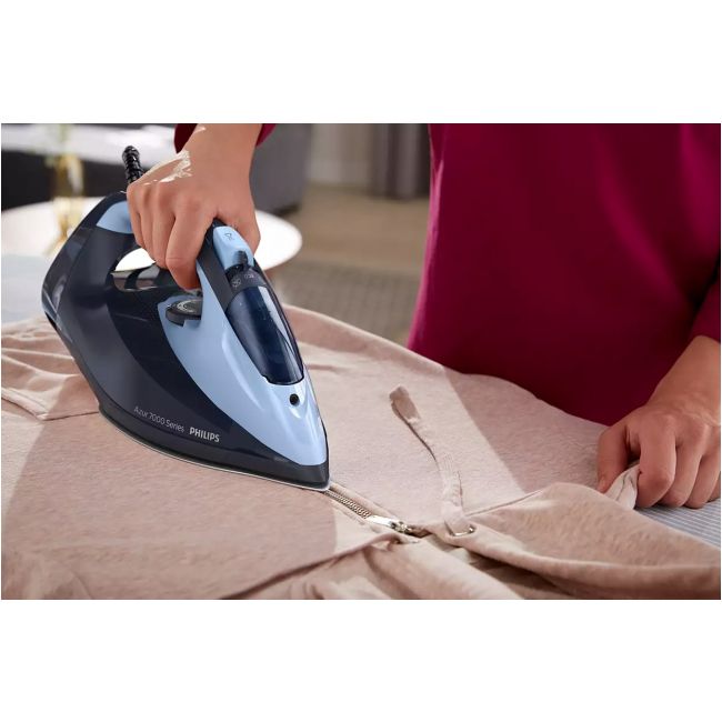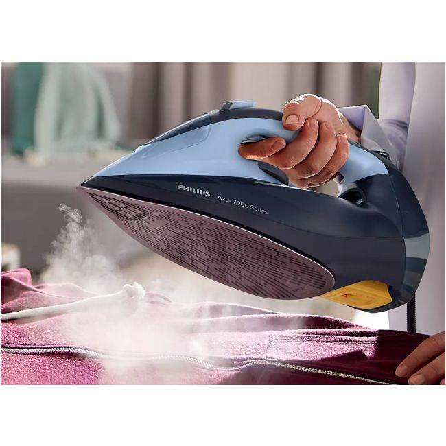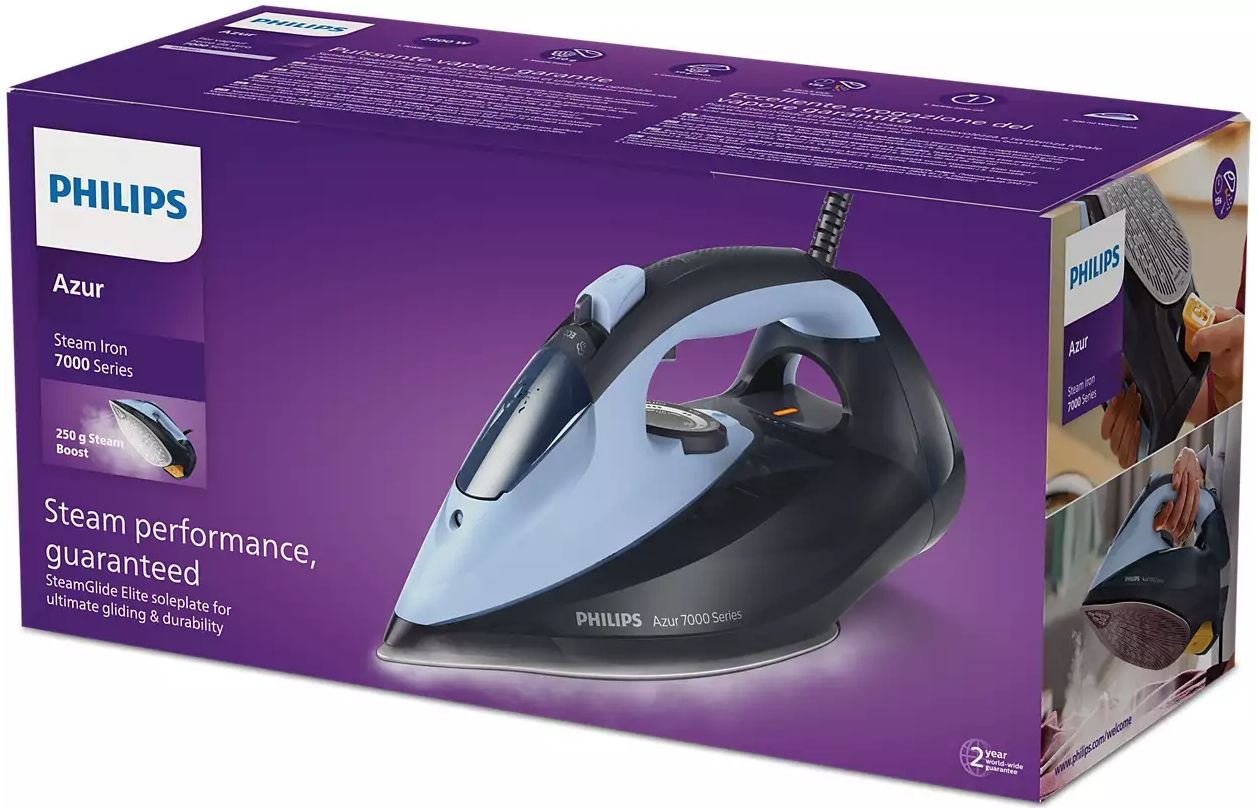 Żelazko parowe Philips Azur 7000 Series DST7041/20 to doskonałe rozwiązanie dla osób poszukujących niezawodnego sprzętu do prasowania. Oferuje liczne funkcje, które sprawią, że prasowanie stanie się prostsze, szybsze i bardziej efektywne. Jego moc wynosząca 2800W gwarantuje szybki rozgrzew, a podwójne uderzenie pary o wartości 250g/min pozwoli na perfekcyjne wyprasowanie nawet najbardziej uporczywych zagnieceń. Dzięki pionowemu wyrzutowi pary, możliwe jest również prasowanie zasłon lub odzieży na wieszaku. Stopa SteamGlide Elite zapewnia optymalne rozprowadzanie pary i doskonałą śliskość na każdym rodzaju materiału. Żelazko jest wyposażone w zbiornik na wodę o pojemności 300ml oraz funkcję regulacji strumienia pary, co umożliwia dostosowanie intensywności prasowania do własnych preferencji. Ważną zaletą żelazka Philips Azur 7000 Series DST7041/20 jest także jego wyjątkowa funkcjonalność. Funkcja Quick Calc Release pozwala na szybkie i łatwe czyszczenie żelazka z kamienia, a technologia blokady kapania zapobiega powstawaniu plam. Co więcej, sprzęt można bezpiecznie używać z wodą prosto z kranu, dzięki wbudowanemu systemowi antywapiennemu. Żelazko wyposażone jest także w funkcję automatycznego oszczędzania energii oraz automatycznego wyłączania, które zapewniają bezpieczeństwo i wygodę użytkowania. Długość przewodu zasilającego wynosi 2 metry, co zapewnia swobodę ruchów podczas prasowania. Żelazko parowe Philips Azur 7000 Series DST7041/20 to doskonały wybór dla osób ceniących sobie wygodę, efektywność i niezawodność.