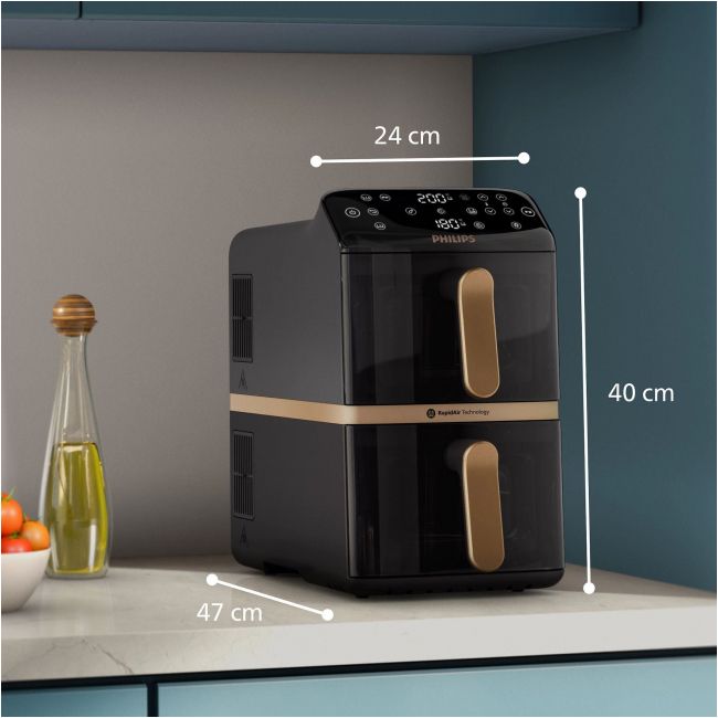 Nasz pionowy Philips Ovi z dwoma koszami pozwala przygotować dwa pełne posiłki jednocześnie, oszczędzając miejsce. Co więcej, dzięki technologii Vertical RapidAir smak posiłków jest zawsze niezwykle wyraźny i delikatny.