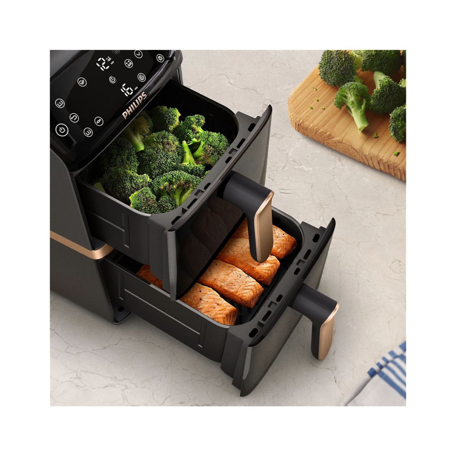 Gotuj do 40% szybciej i oszczędzaj do 65% energii, korzystając z urządzenia Philips Dual Basket Airfryer (w porównaniu do używania piekarnika***).